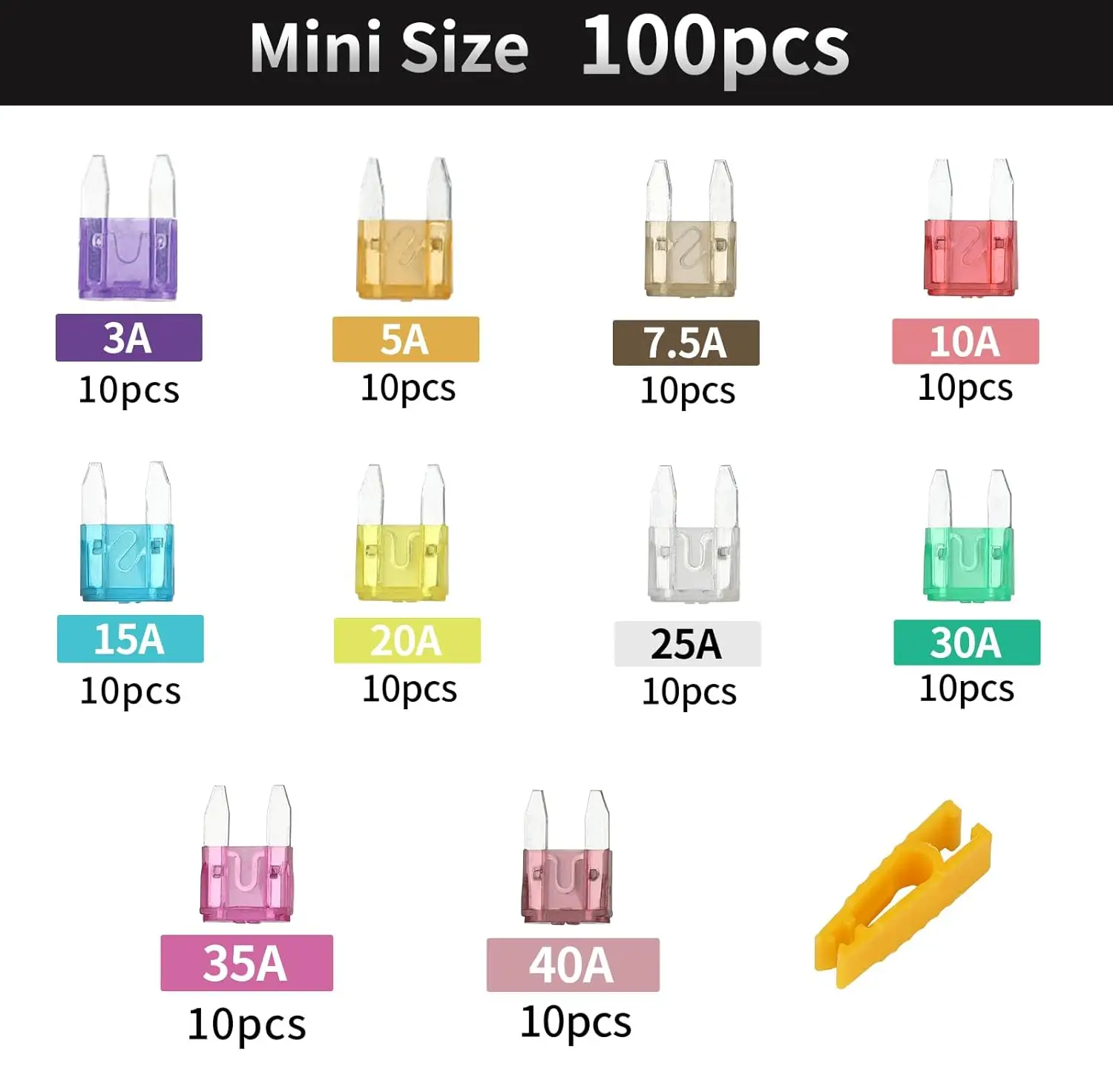 100 Pcs Car Fuses Assortment Kit, Blade Fuse Assortment Kit(3A 5A 7.5A 10A 15A 20A 25A 30A 35A 40A) (with Puller Tool) for Car, Marine, Truck, RV Fuse Replacement (Mini)