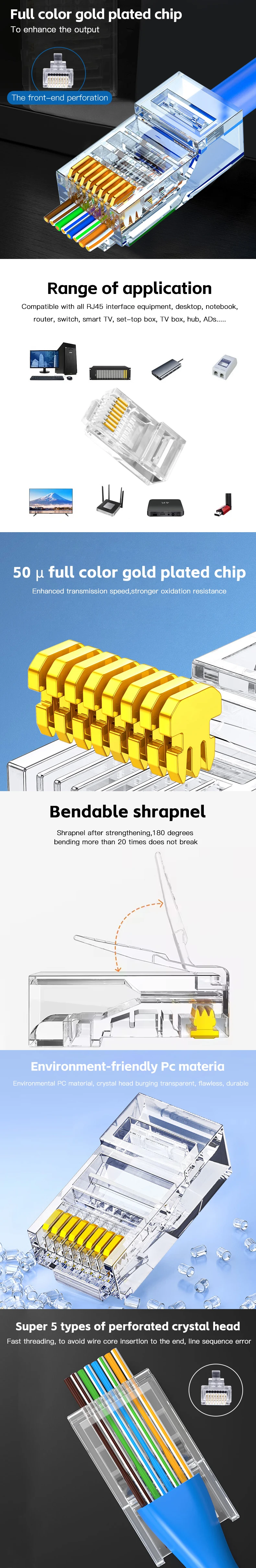 • Perforated Crystal Head :The perforated crystal head design ensures a secure connection between the network cable and the RJ45 port.