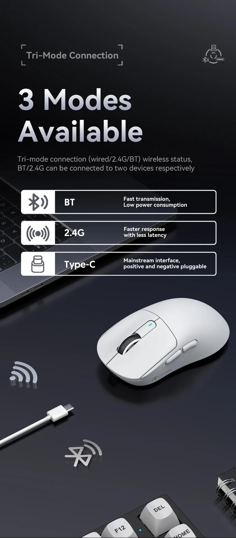 Tri-mode connection(wired/2.4G/BT) wireless status,