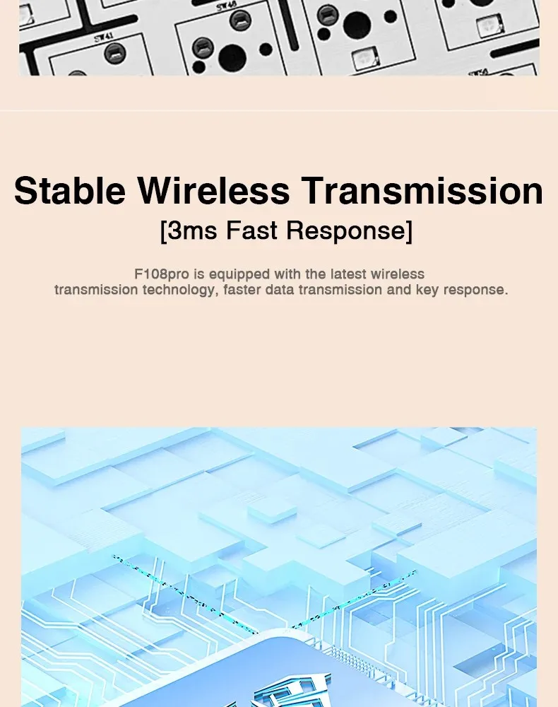 F108pro is equipped with the latest wireless transmission technology, faster data transmission and key response.The keyboard supports 1000Hz return rate, even in complex wireless environments.Faster response and no more delays