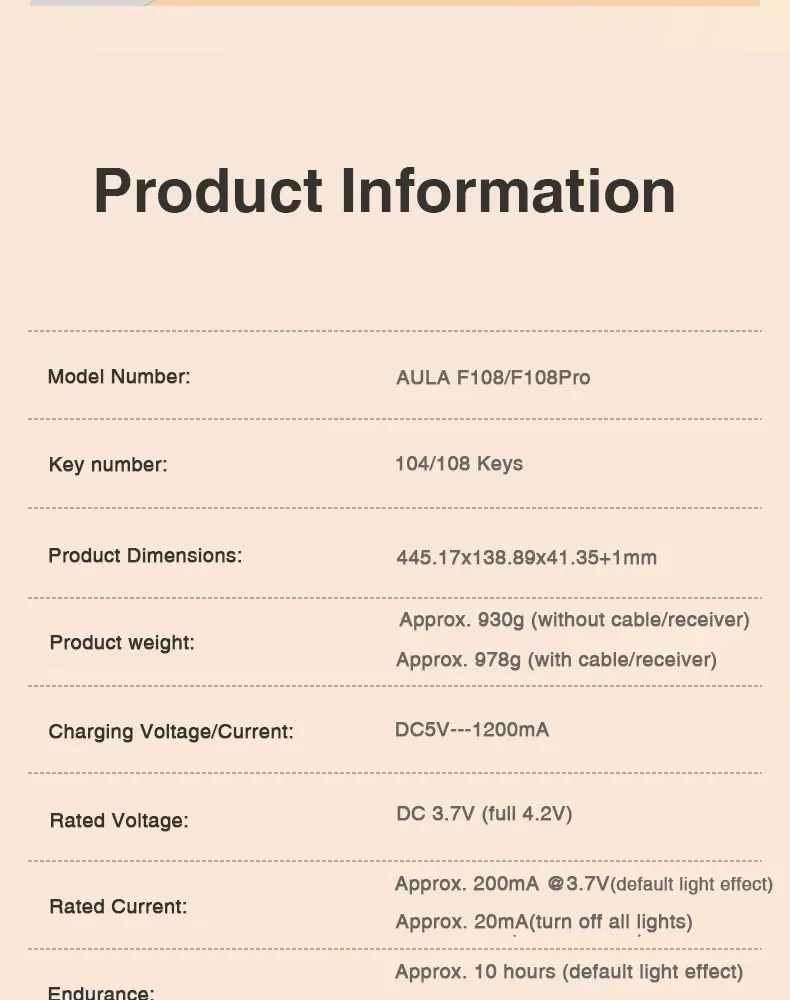 The AULA F108Pro features an 8000 mAh high-capacity battery and a low-power wireless chip, so say goodbye to frequent charging and keep your inspiration and passion online.