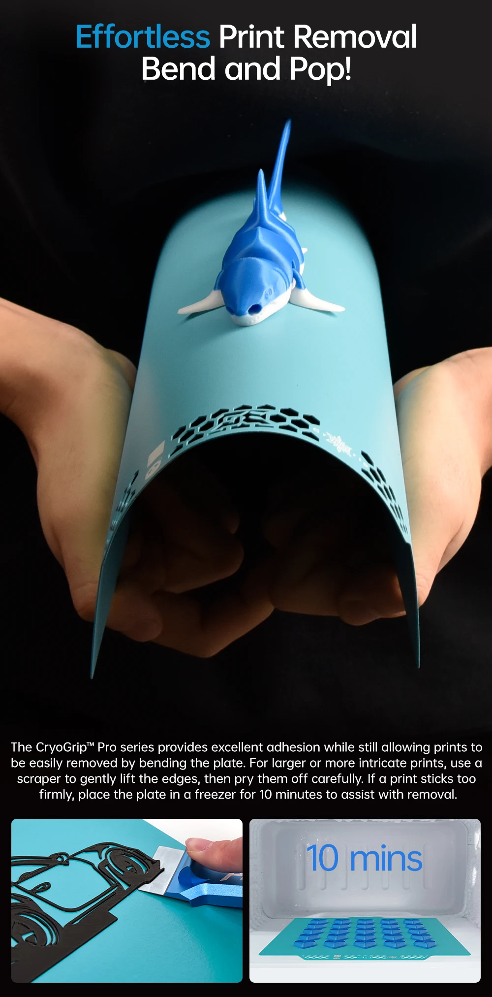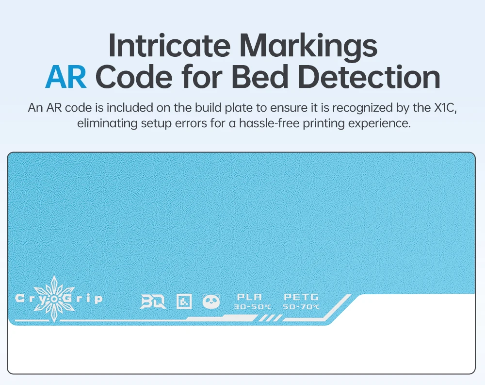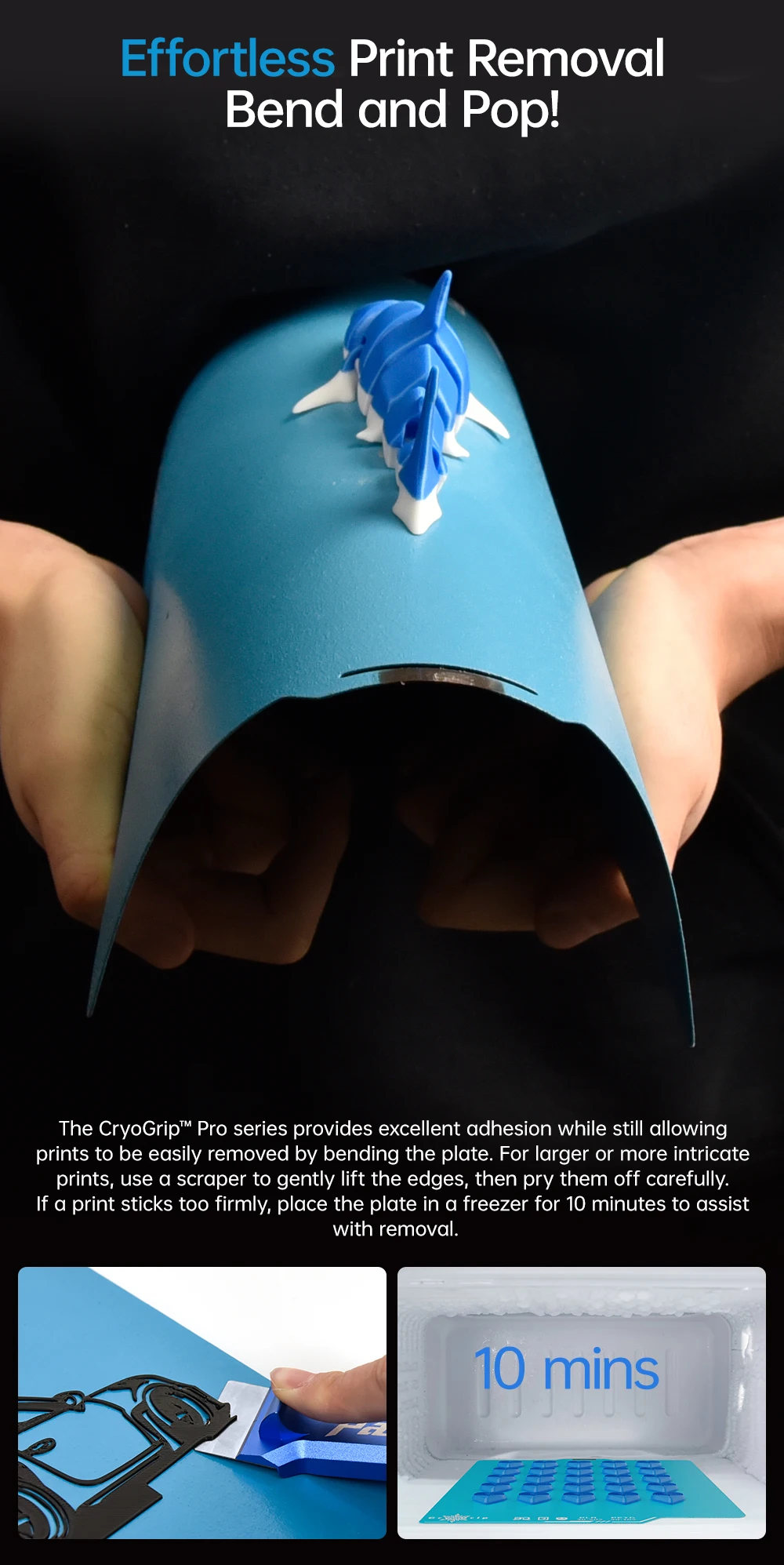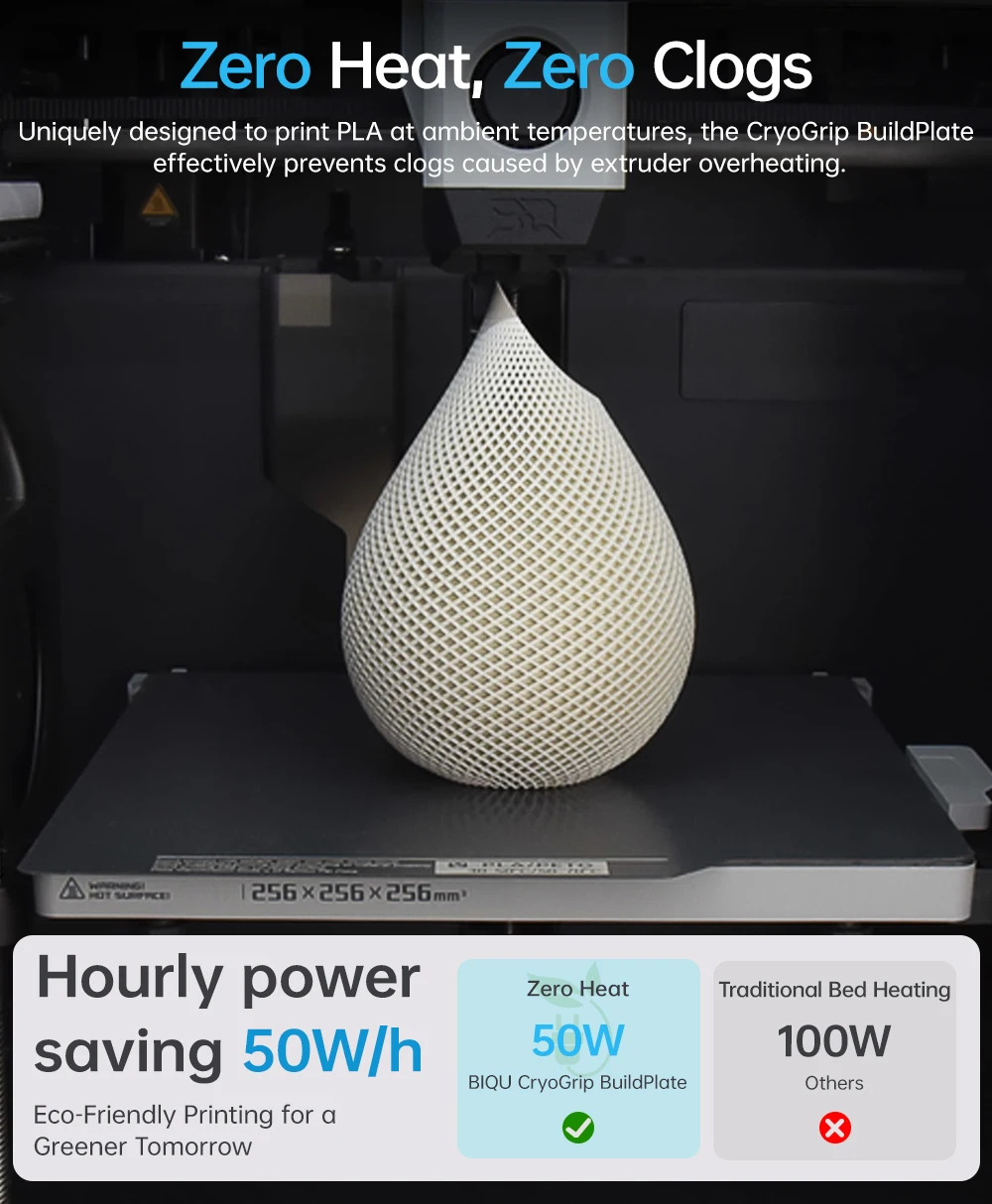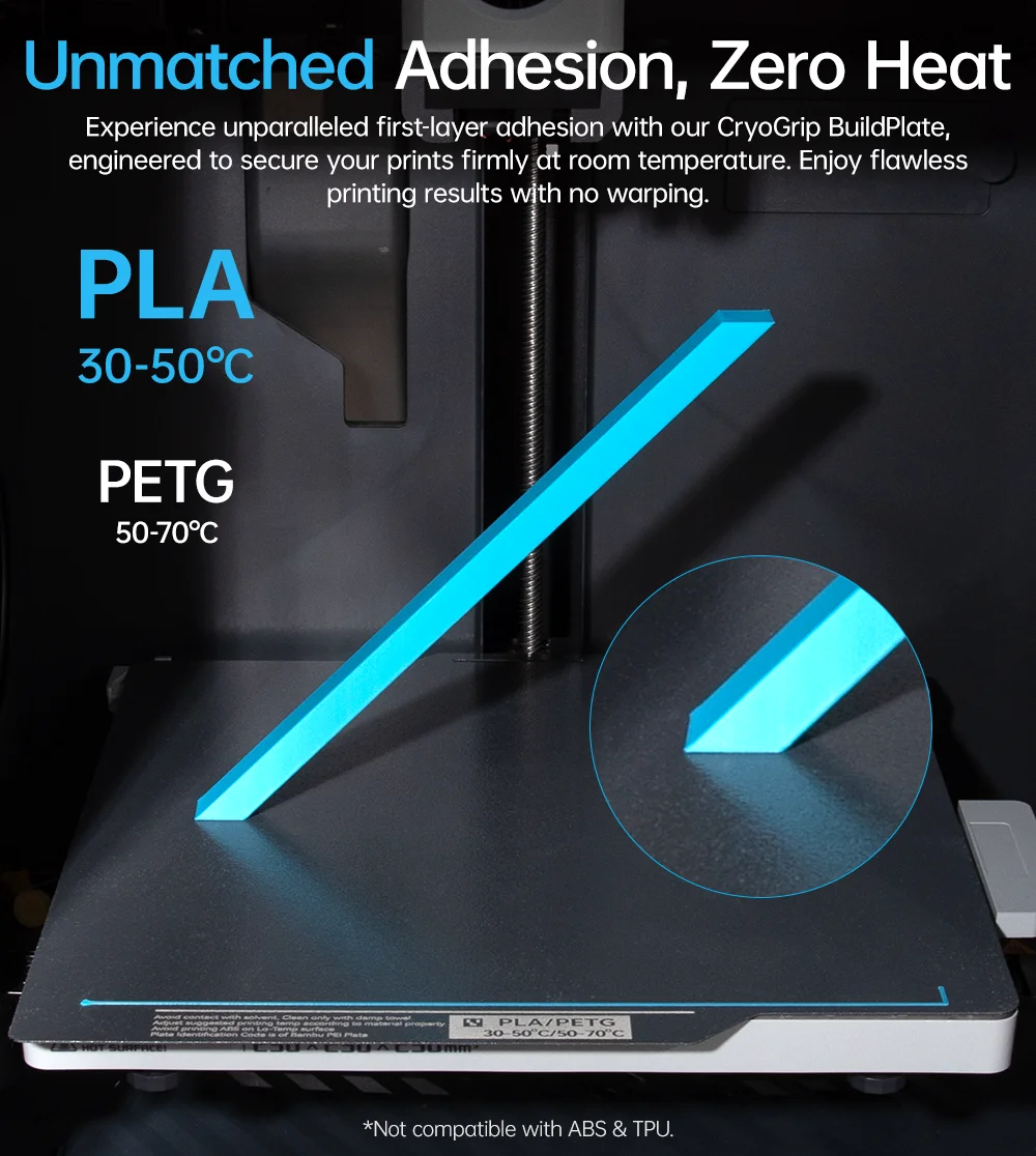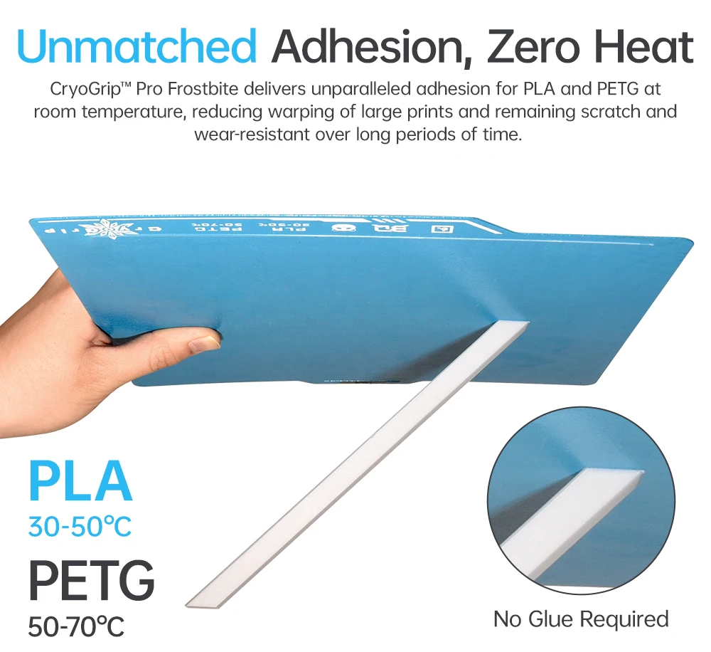 Experience unparalleled first-layer adhesion with our Cryogrip Buildplate,engineered to secure your prints firmly at room temperature . Enjoy flawless printing results with no warping