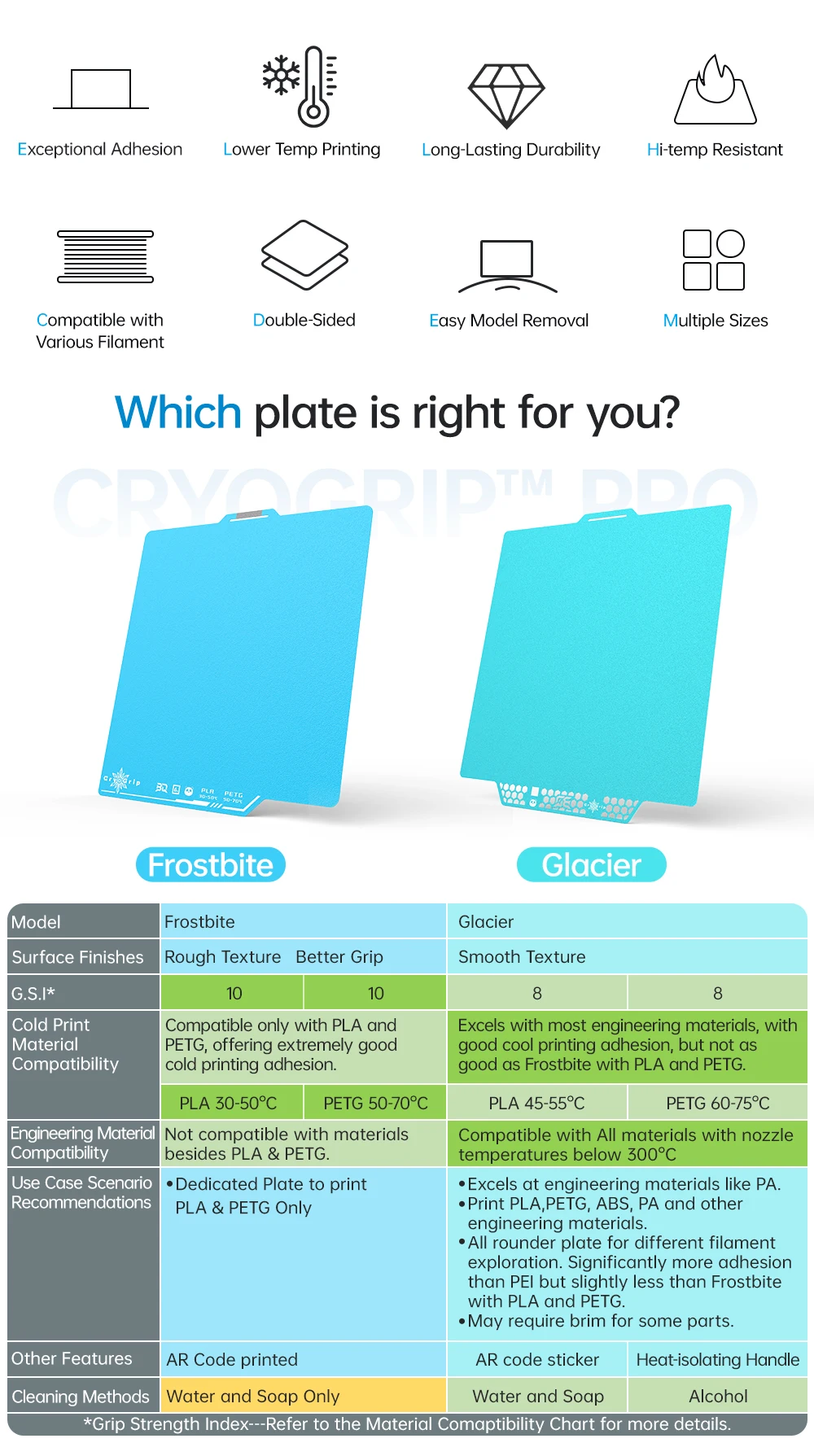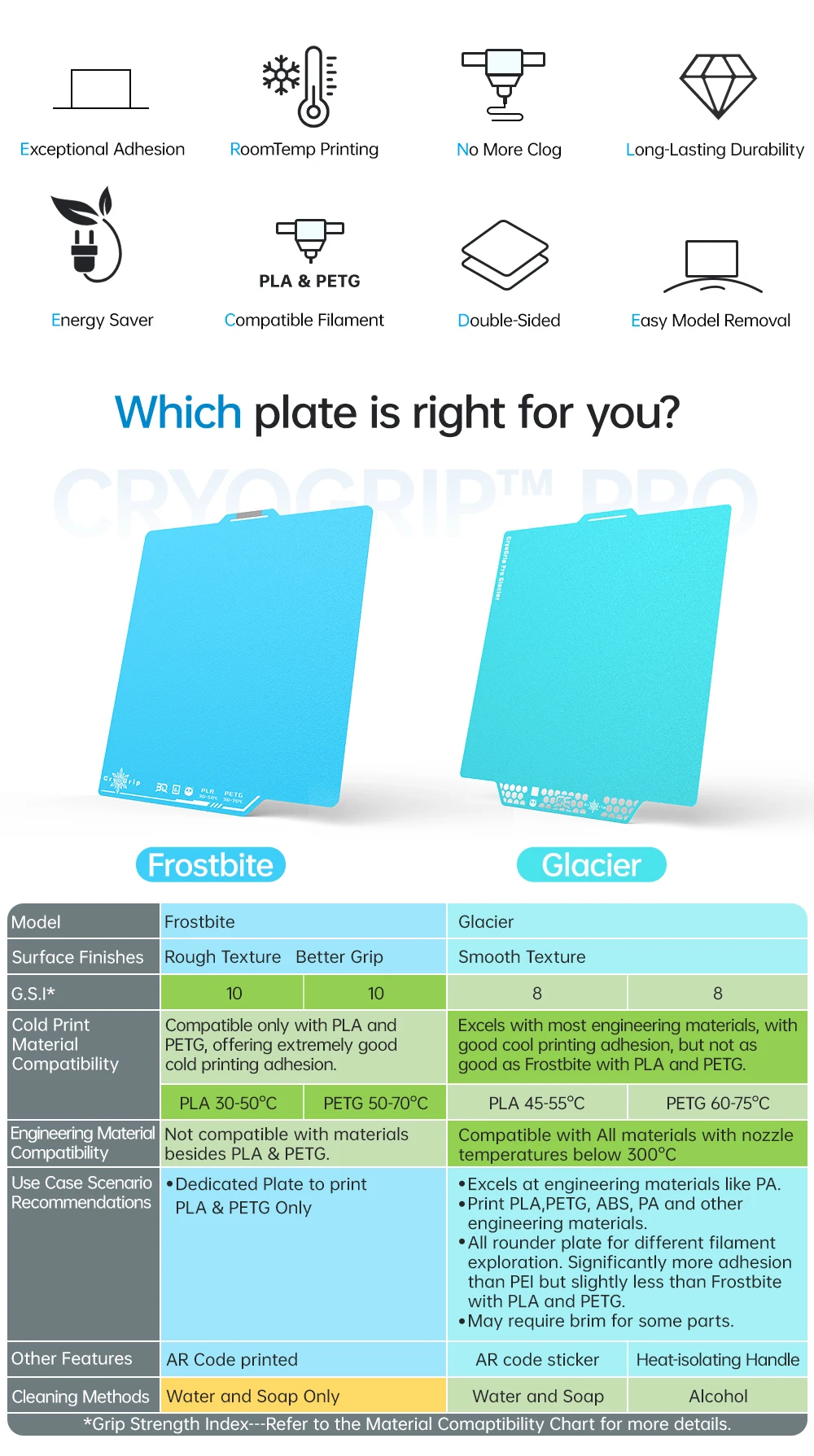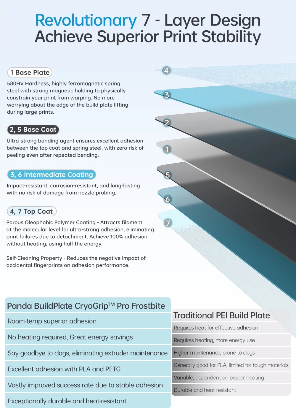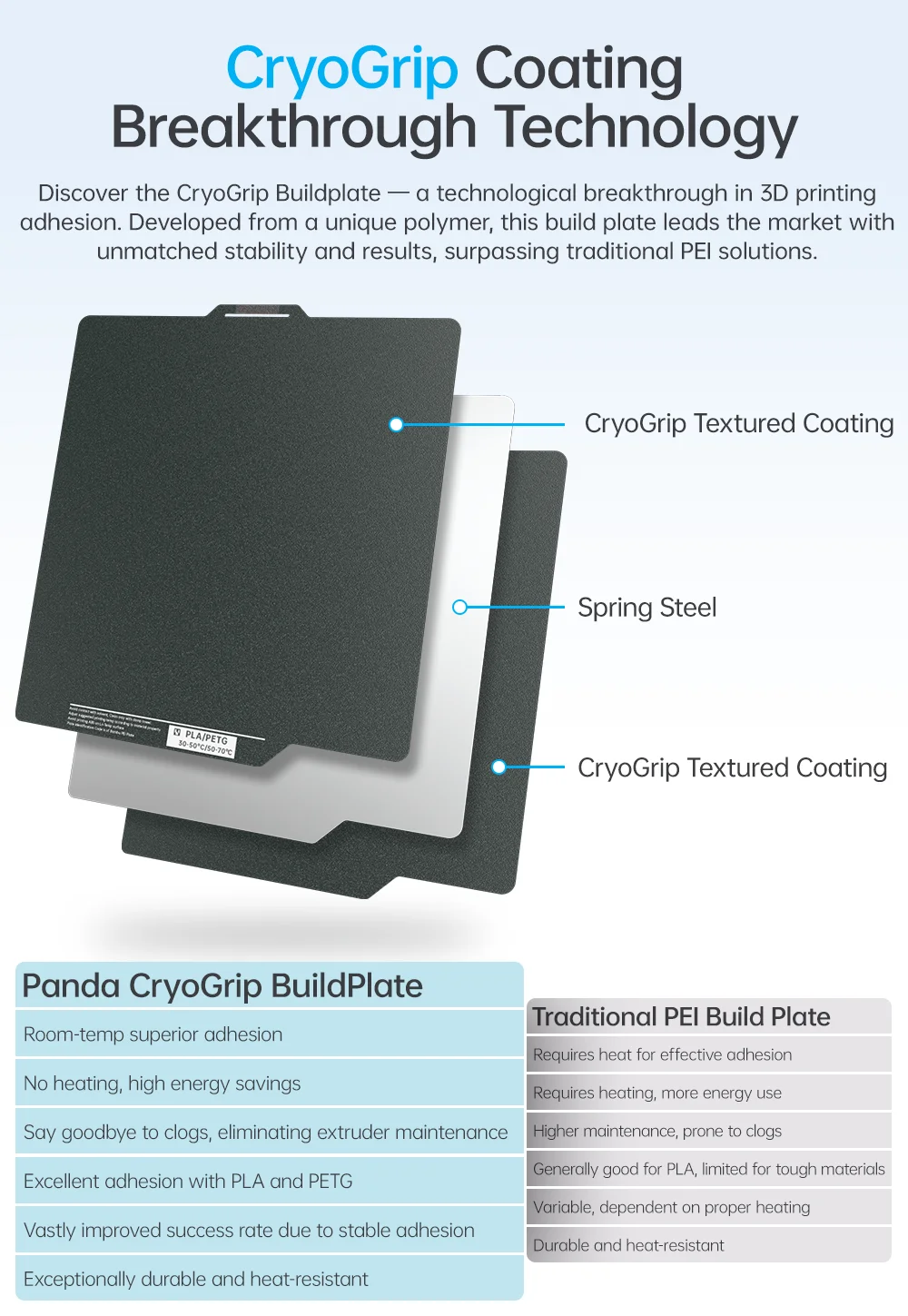 Discover the Cryogrip Buildplate - a technological breakthrough in 3D printing adhesion . Developed from a unique polymer , this build plate leads the market with unmatched stability and results , surpassing traditional PEI solutions
