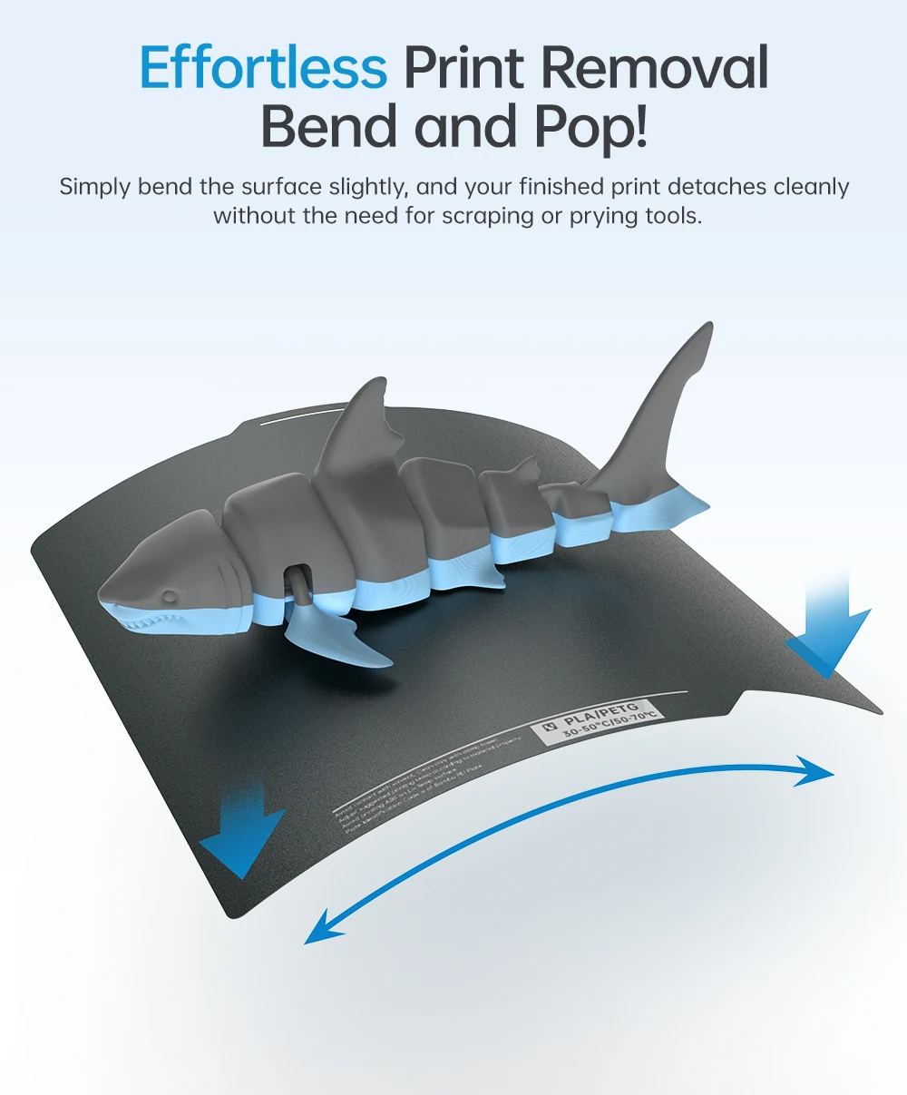 Simply bend the surface slightly , and your finished print detaches cleanly without the need for scraping or prying tools