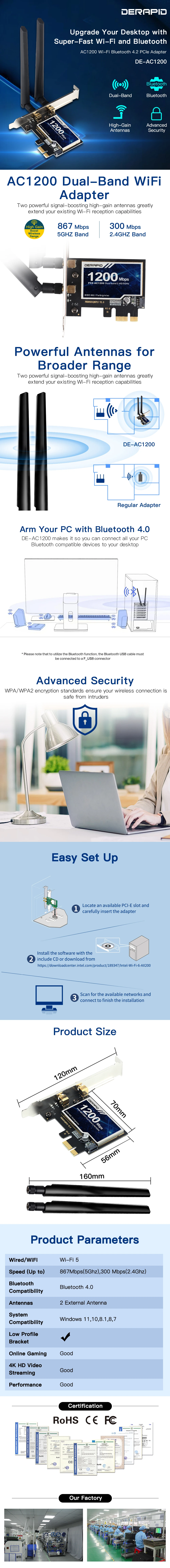 Derapid AC1200 WiFi Adapter Bluetooth Dual Band 2.4GHZ/5Ghz PCIE Wireless Network Card Intel Chip For Desktop For Windows7/10/11