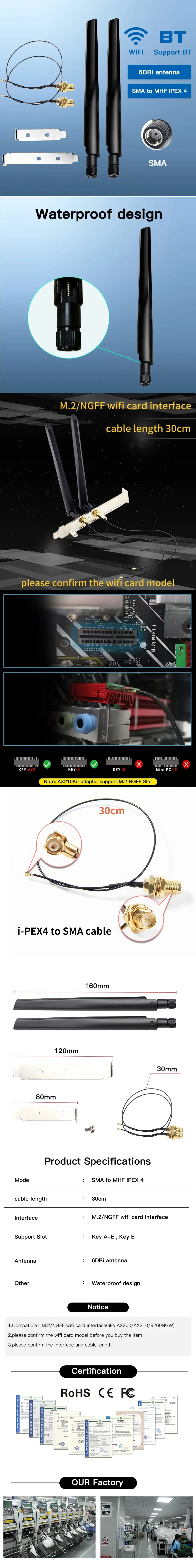Fenvi 2pcsx6dbi antenna set AX210 nillkin M.2 WiFi card 2.4/5GHz Dual Band mhf4 extension cable to WiFi RP-SMA for AX210/AX200/9260