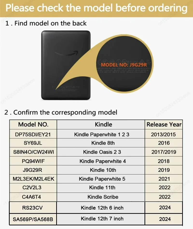 Note:The case for New Kindle 11th Generation 2022 C2V2L3 and New Kindle 12th Generation 2024 6 inch RS23CV are univeral.And The case for New Kindle 12th Generation 2024 6 inch RS23CV and Kindle Paperwhite 12th Generation 2024 7 inch SA569P SA568B are different.