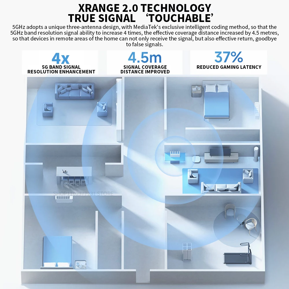 ● Xrange2.0 Technology: Unique three-antenna design for 5GHz band, improving signal analysis capability, increasing coverage distance by 4.5 meters, and reducing game latency by 37%.