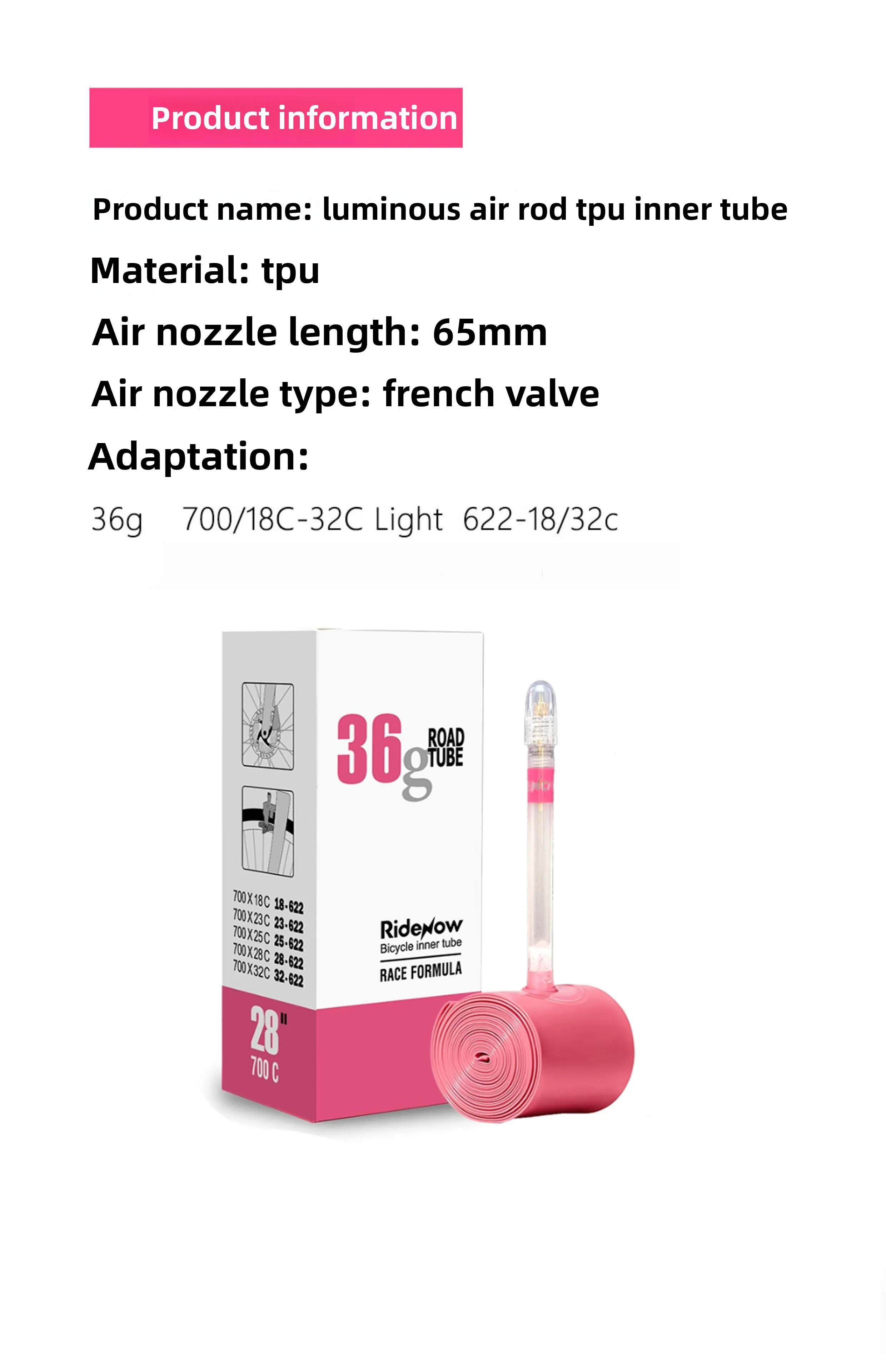 RideNow Bike Inner Tube 700C18 23 25 28 30 32 Road Glowing valve Bicycle TPU Tire 65mm Ultralight 36g French Valve Accessories
