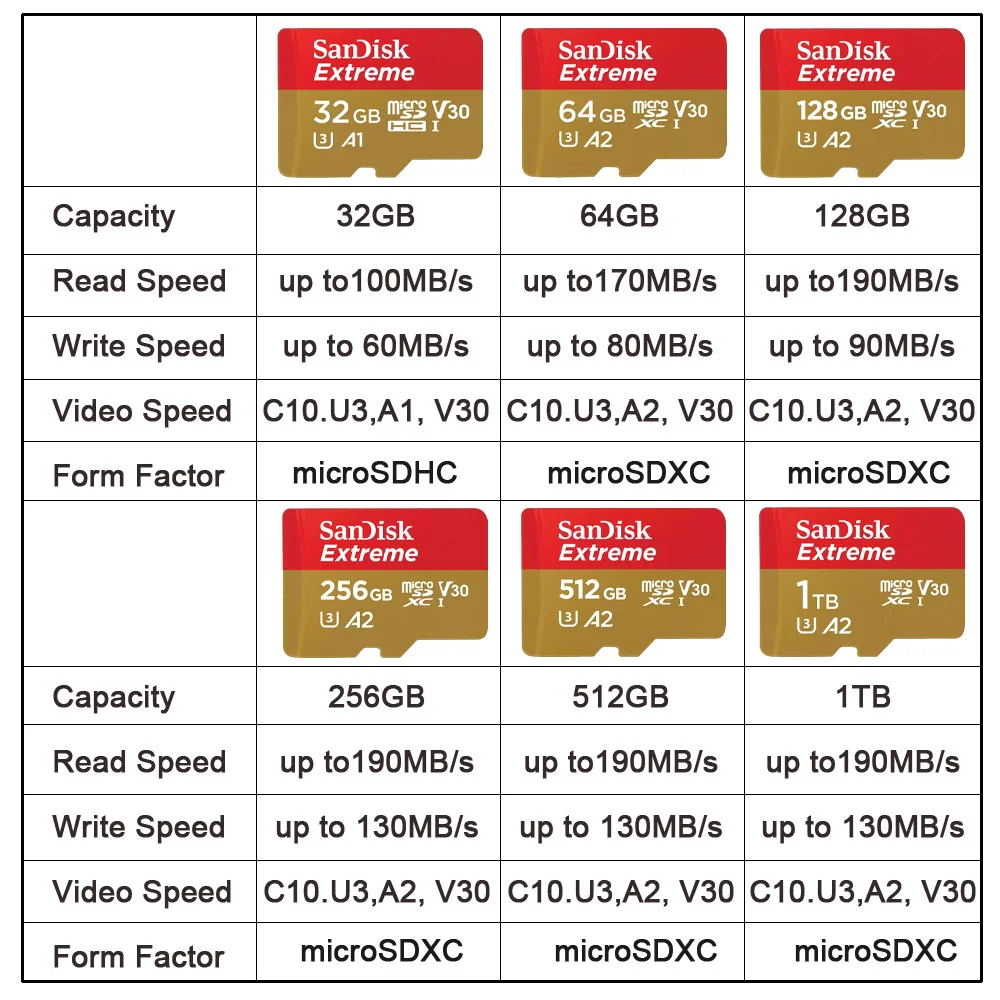 SanDisk Extreme microSD 1TB 512GB 256GB Memory Card A2 U3 UHS-I Cards USB3.0 4K Flash micro SD Card for Camera GoPro DJI drone