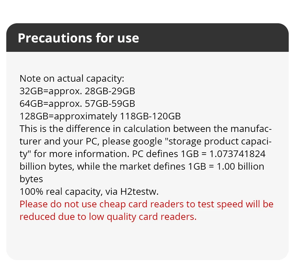 This is a calculated difference between the manufacturer and your PC, please google "storage product capacity" for more information. 1GB as defined by PC = 1,073,741,824,000,000 bytes, while 1GB as defined by the market = 1,000,000,000,000 bytes100% true capacity by H2testw.Please do not use cheap card readers for testing, the speed will be reduced due to low quality readers.